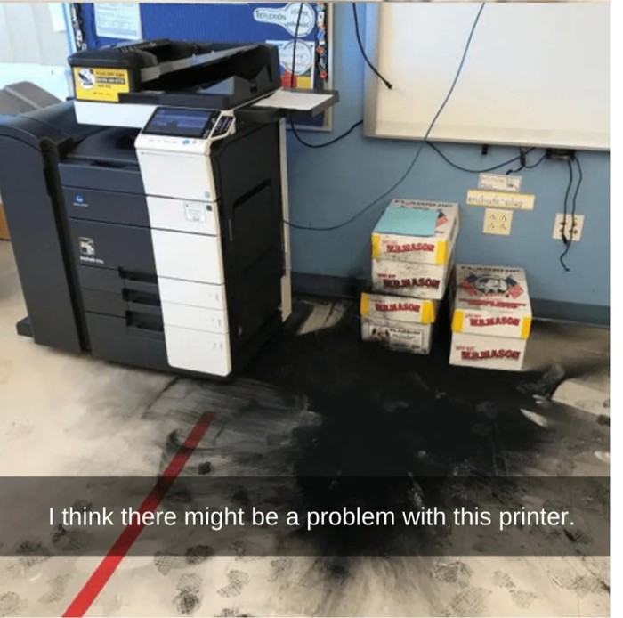 Orang ini terkejut ketika printer mereka tidak berfungsi, menyebabkan ledakan tinta hitam di seluruh lantai! Berantakan sekali. Foto: Drivepedia