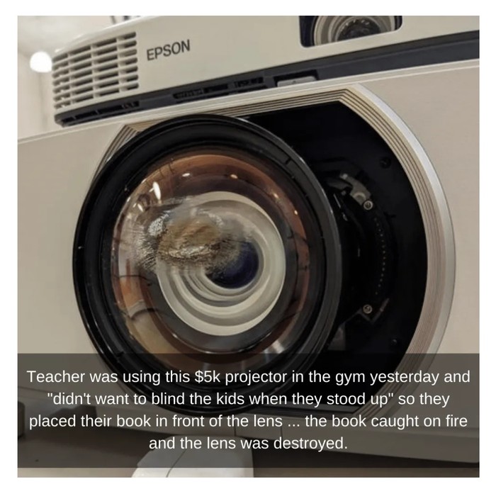 Proyektor sekolah adalah peralatan yang mahal, tetapi diperlukan untuk pengajaran yang efektif. Guru olahraga ini membuat kesalahan fatal ketika mereka memutuskan untuk memegang buku dan menutupi bagian depan proyektor untuk melindungi penglihatan siswa. Hal ini menyebabkan proyektor menyala dan menghanguskan lensa. Foto: Drivepedia