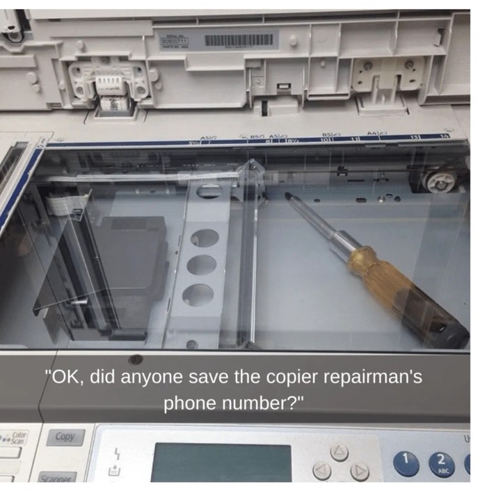 Ketika bukan orang profesional terlatih untuk memperbaiki mesin fotokopi, jadinya obeng besar malah tertinggal di dalam mesin. Foto: Drivepedia