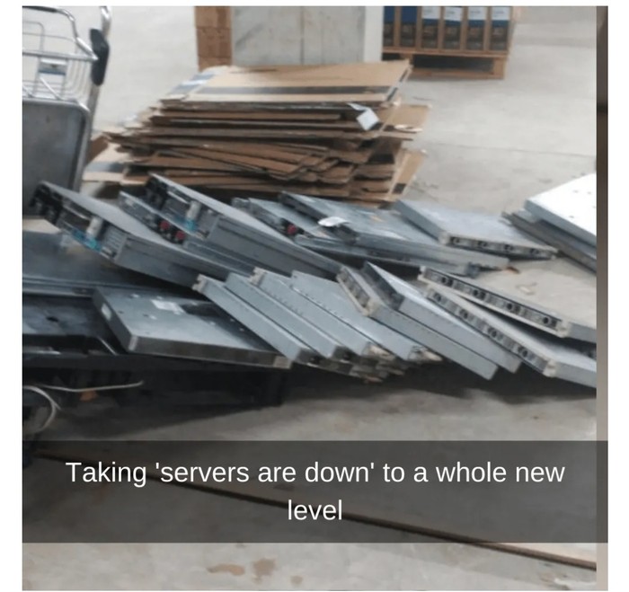 Dalam istilah dasar, server hanyalah perangkat lunak yang berjalan di komputer, baik secara lokal maupun jarak jauh. Terkadang, orang TI menyebut komputer yang sangat kuat sebagai "server" untuk membedakannya dari laptop dan desktop yang kami semua gunakan untuk menyelesaikan pekerjaan rumah online kami, mengirim email pekerjaan yang membosankan, dan menelusuri video YouTube lucu. Ketika server mati, mungkin ada banyak masalah potensial. Dalam hal ini, server benar-benar mati, secara fisik jatuh ke tanah. Foto: Drivepedia
