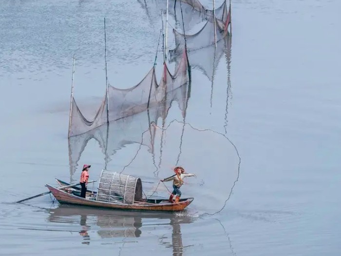 Model-model ini berdandan seperti nelayan dan menunggu aba-aba dari fotografer untuk menebar jala. Popularitas desa ini meningkat karena banyak orang terinspirasi oleh YouTuber Li Ziqi yang selalu menampilkan keindahan hidup di pedesaan. Foto: Weibo