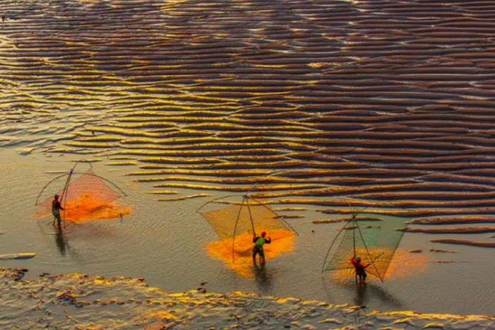 Seperti pada foto ini. Mereka sejatinya orang-orang yang pura-pura berperan sebagai nelayan di desa itu untuk kebutuhan wisatawan. Foto: Weibo