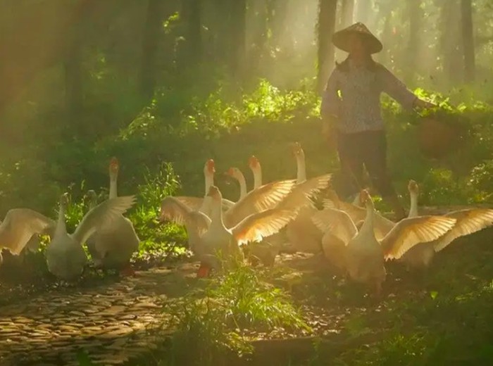 Model yang pura-pura jadi petani menggembala bebek. Para model yang berperan sebagai petani, nelayan, pedagang di desa itu, menawarkan jasa untuk berpose natural untuk koleksi foto. Foto: Weibo