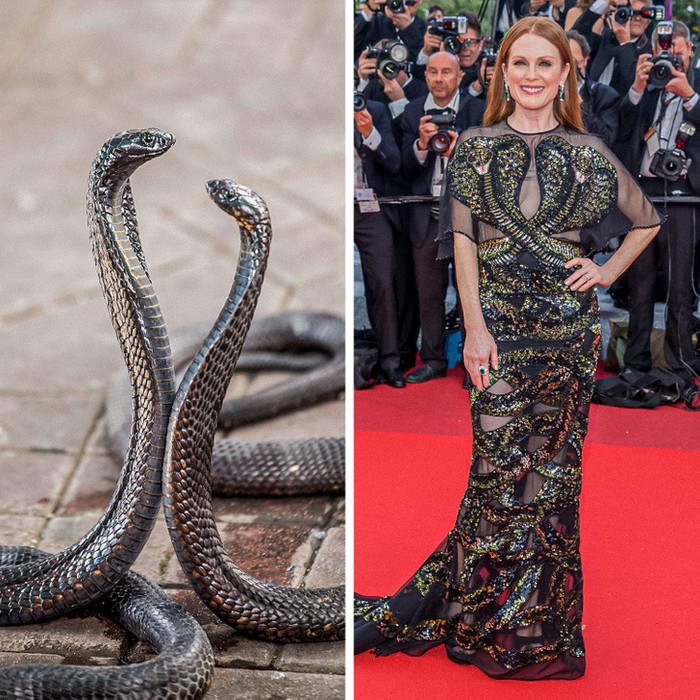 Aktris senior Julianne Moore memiliki gaun serba hitam dengan gambar ular cobra. Foto: Brightside