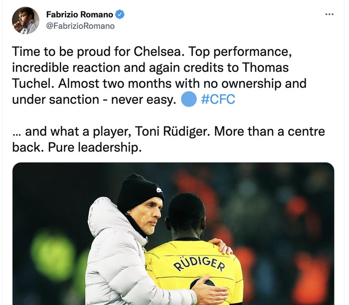 "Waktunya untuk bangga pada Chelsea. Performa top, reaksi luar biasa dan sekali lagi kredit pada Thomas Tuchel Hampir dua bulan tanpa pemilik dan disanski, tidak pernah mudah," tulis Fabrizio Romano. Foto: Twitter