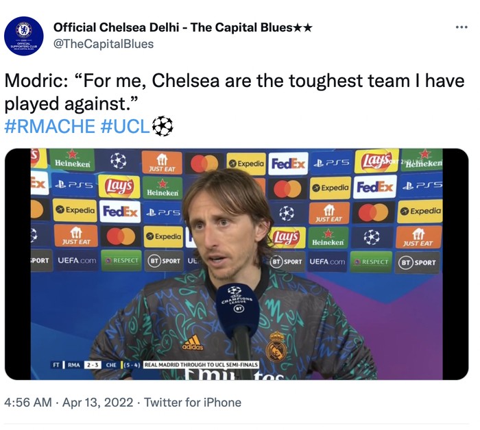 "Bagi saya, Chelsea adalah lawan terberat yang pernah saya hadapi," kata Luca Modric. Foto: Twitter