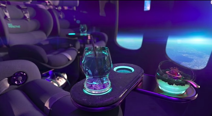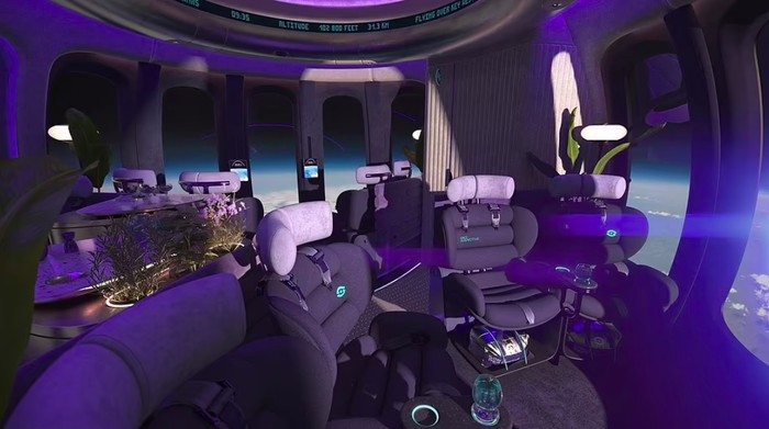 Dominasi warna gelap, ungu, dan pencahayaan yang redup, membuat suasananya kontras dengan kendaraan wisata luar angkasa para pesaingnya yang didominasi warna putih. Foto: Space Perspective