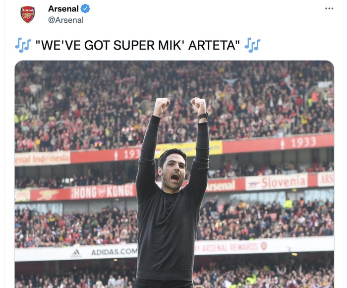 Akun resmi Arsenal memuji sang pelatih Mikel Arteta. Foto: Twitter