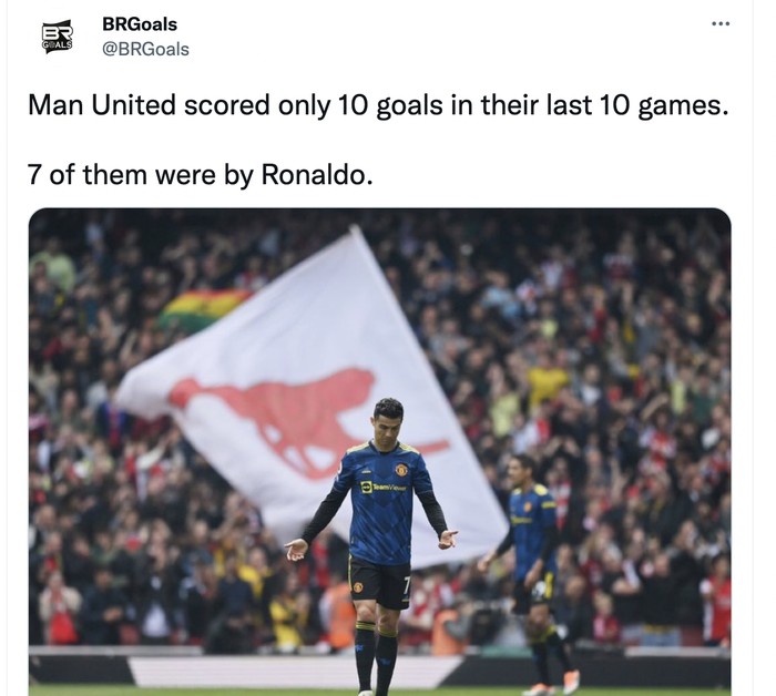 Ronaldo menyumbang 7 dari 10 gol dalam 10 pertandingan terakhir MU. Foto: Twitter