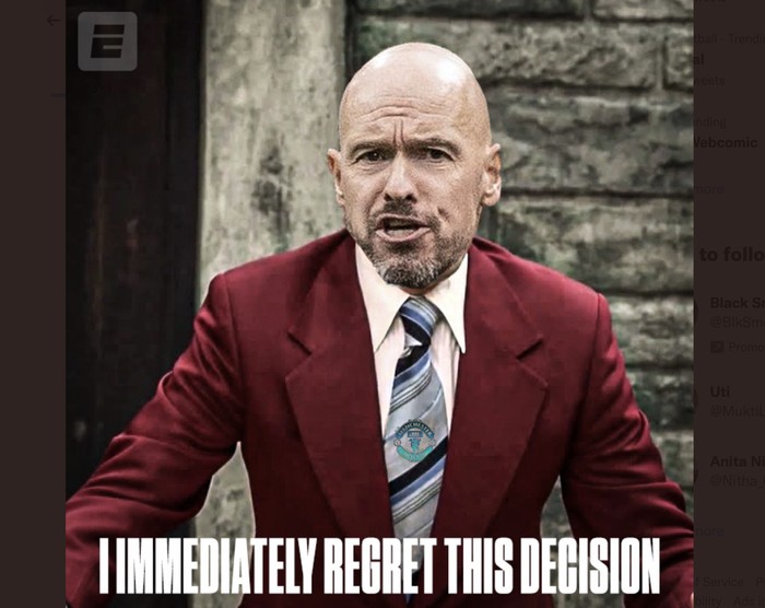 Meme Erik Ten Hag langsung menyesal jadi pelatih MU setelah melihat MU kalah terus. Foto: Twitter