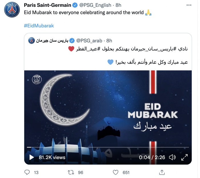 Ucapan Selamat Lebaran dari Paris Saint Germain. Foto: Twitter