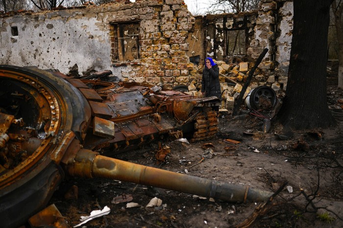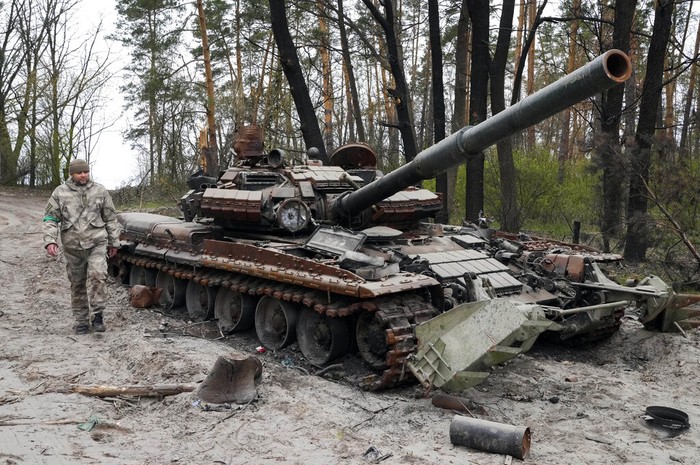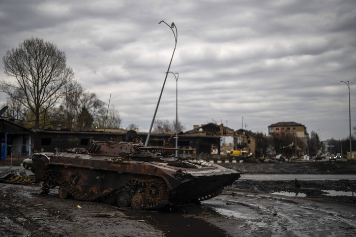 Tank lainnya milik Rusia yang hancur di kota Borodyanka, Ukraina. Kemenhan Ukraina mengklaim ratusan tank Rusia rusak. Terlebih Ukraina dibantu rudal penghancur tank canggih seperti Javelin dari Amerika Serikat dan Next Generation Antitank Weapon dari Inggris. Foto: Associated Press