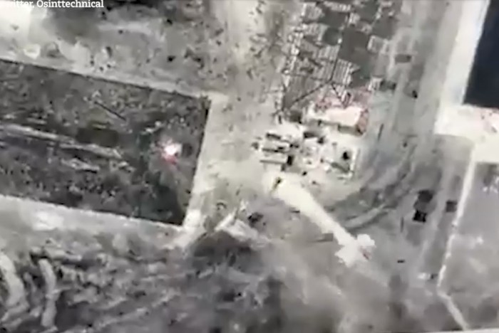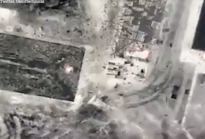 Tampak bom mulai dijatuhkan ke sasaran. Foto: Twitter