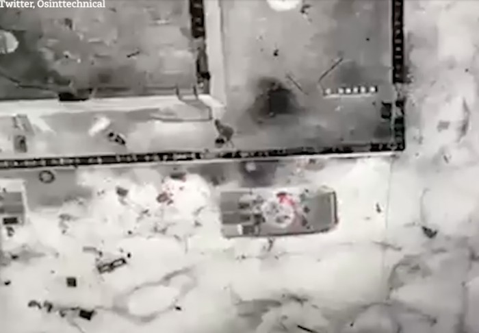 Mengenai drone yang digunakan belum ada informasi, kemungkinan Bayraktar TB-2. Amerika Serikat memang telah memberi bantuan drone seperti Switchblade, tapi drone itu mengancurkan sasaran dengan menabrakkan diri, bukan menjatuhkan bom. . Foto: Twitter