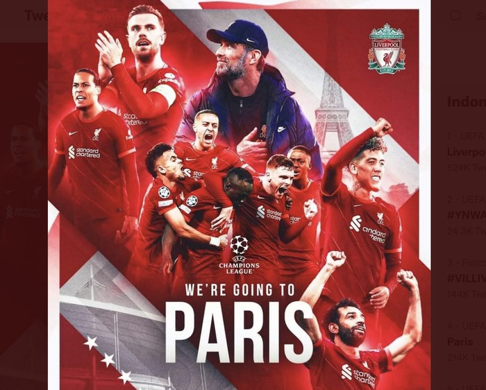 Liverpool akan menuju ke final yang digelar di kota Paris. Foto: Twitter