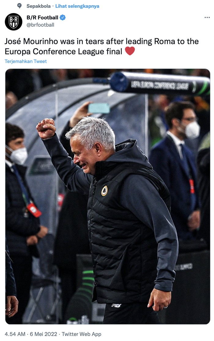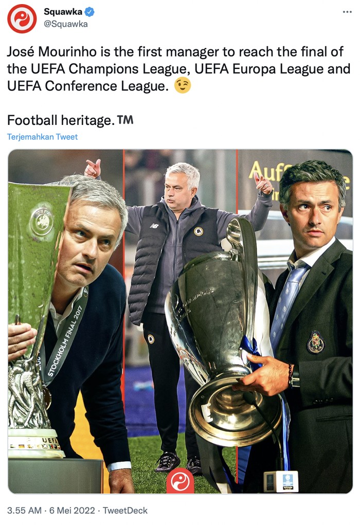 Apabila menang di final Conference League, artinya Mourinho jadi pelatih pertama membawa tim meraih trofi Eropa di berbagai level. Foto: Twitter