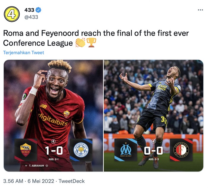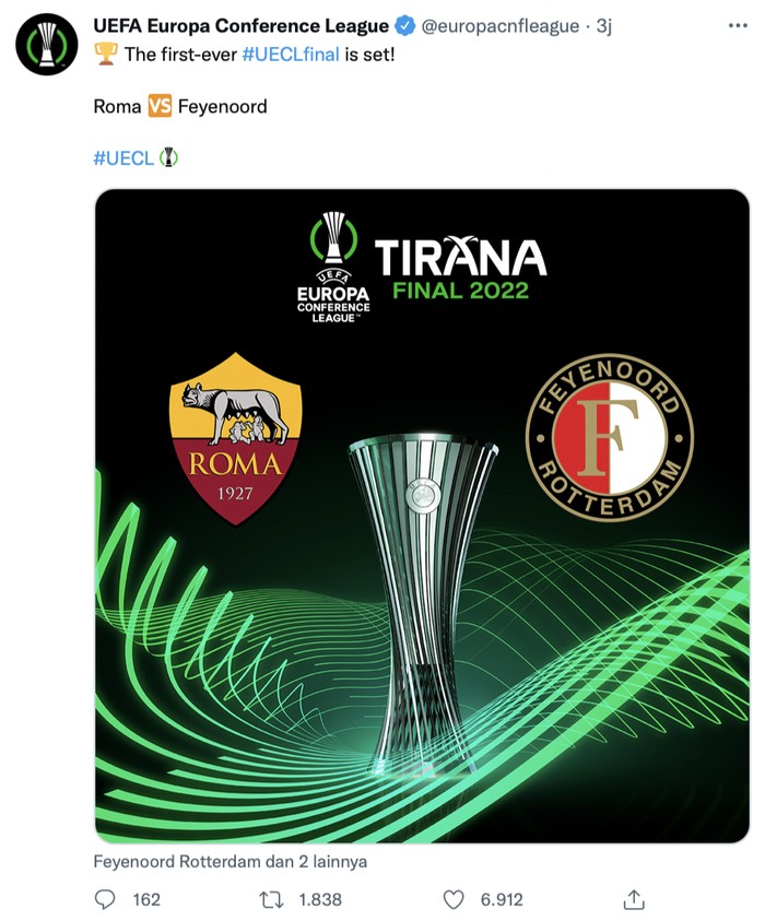 Di final Conference League, AS Roma akan berhadapan dengan tim asal Belanda Feyenoord. Foto: Twitter