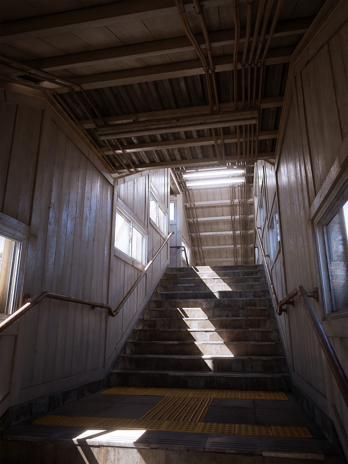 Mulai dari rel keretanya, tangga, cahaya lampu, sinar matahari, bentuk bangunan, suara seperti burung yang saling bersahutan, seakan nyata. Foto: (Artstation: Lorenzo Drago).