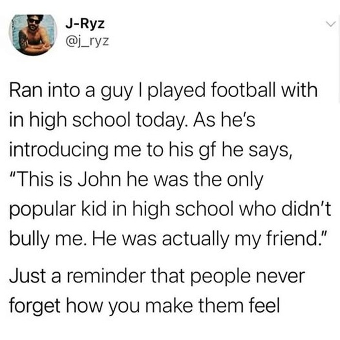 Kebaikan kecilmu mungkin akan diingat sebagai kebaikan besar bagi seseorang. Jangan suka bully orang lain. "Ini adalah John, satu-satunya siswa populer di sekolah yang tidak mem-bully aku. Dia adalah temanku," kisah orang di cuitan ini ketika bertemu dengan teman yang tidak ia bully. Foto: Pritam Singh Rathore via Bored Panda