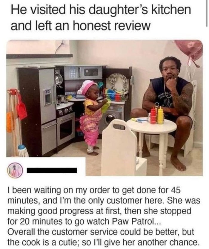 Ceritanya lagi review pelayanan di kafe-kafean sang anak, 20 menit habis untuk si anak nonton Paw Patrol. Tapi tetap senang kok, soalnya anaknya lucu. "Secara keseluruhan, pelayanan konsumen bisa lebih baik, tapi kokinya cute, jadi aku akan memberinya kesempatan lagi." Foto: George Balzuck via Bored Panda