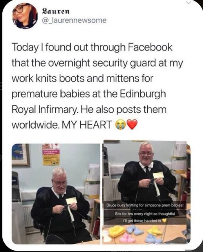 Seorang tenagak keamanan meluangkan waktunya untuk merajut demi bayi-bayi prematur, total hero! Foto: Amy Dillon via Bored Panda