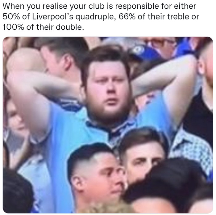 Liverpool juara Piala FA 2021/2022 dengan mengalahkan Chelsea lewat adu penalti. Langsung banyak meme memuji pelatih Jurgen Klopp. Dia kini sudah memenangkan semua jenis piala yang tersedia untuk klub. Foto: (Twitter)