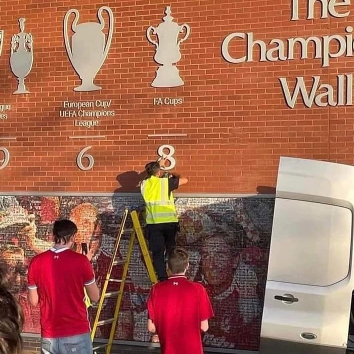 Meme petugas menambah angka di jumlah piala Liverpool. Mereka sudah 8 kali juara Piala FA. Foto: (Twitter)