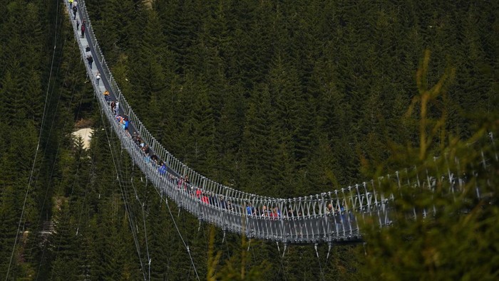 Pemandangan jembatan gantung untuk pejalan kaki yang merupakan konstruksi terpanjang di dunia di Dolni Morava, Republik Ceko, Kamis 12 Mei 2022 lalu.