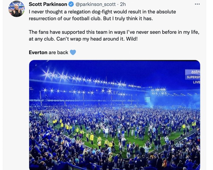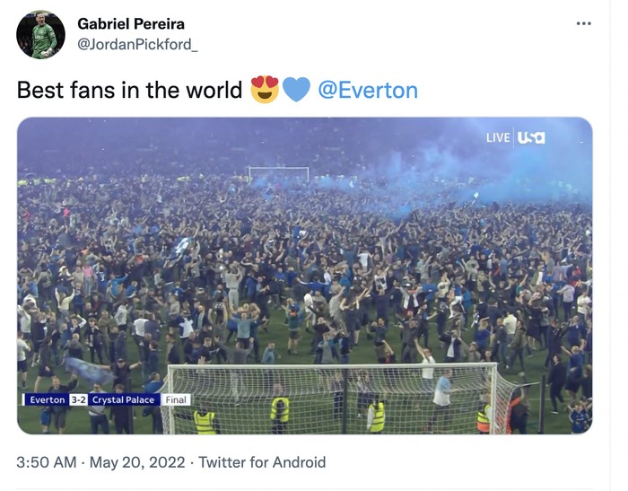 Suporter Everton langsung menyerbu ke lapangan begitu laga usai dan Everton bertahan di Liga Inggris. Rasanya seperti menang Liga Champions, menurut akun ini. Foto: Twitter