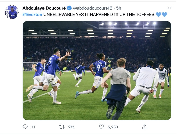 Akun resmi Everton pun merayakannya dengan merekam kegembiraan suporter. Foto: Twitter