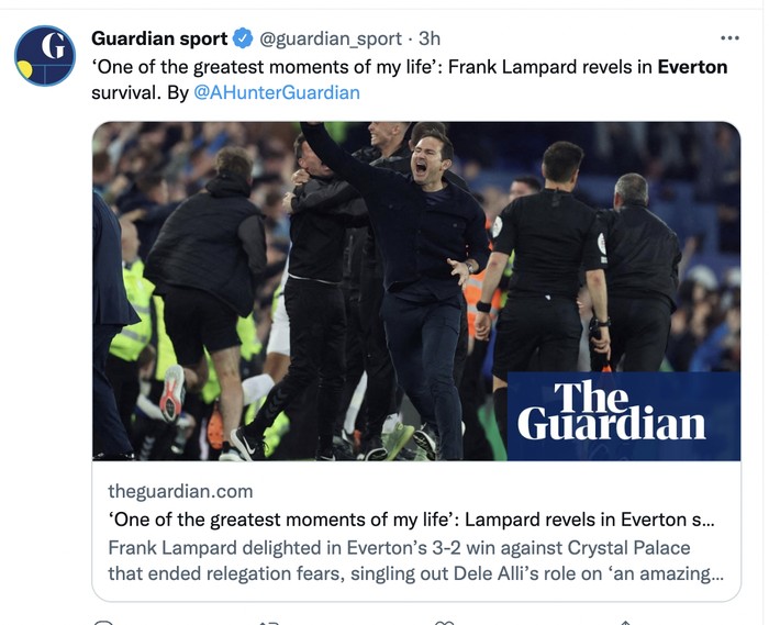 Headline media di Inggris pun mengabarkan Everton telah selamat dari degradasi serta bagaimana tanggapan Frank Lampard. Foto: Twitter
