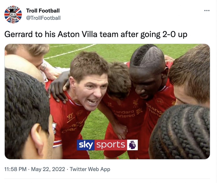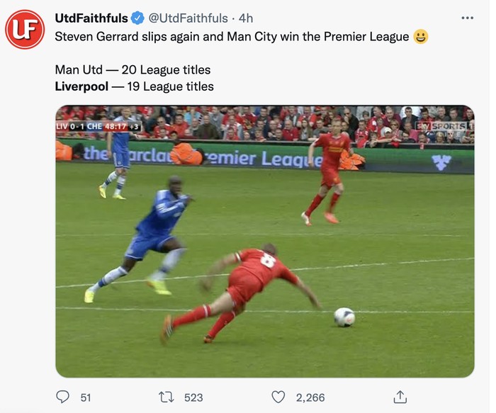 Meme Steven Gerrard terpeleset lagi sehingga Liverpool gagal juara di saat-saat terakhir, seperti dulu saat di masih jadi pemain. Foto: Twitter