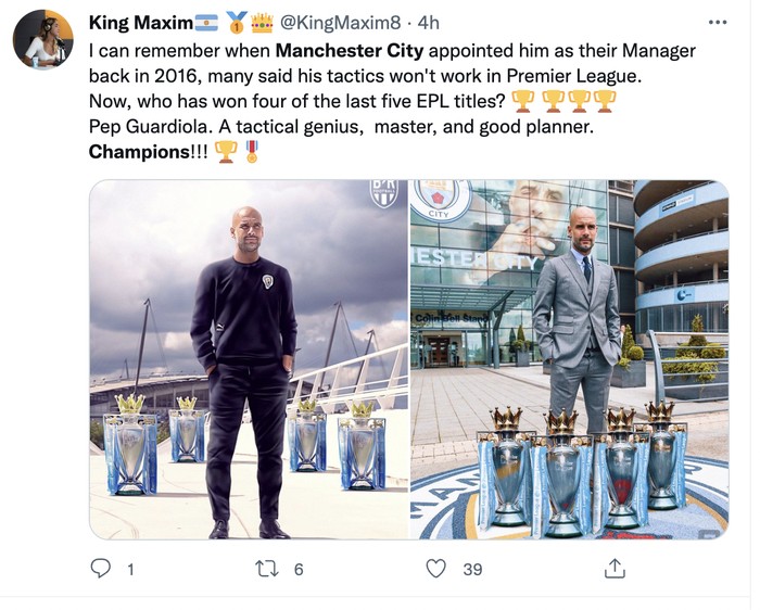 Netizen ini memuji Guardiola. "Saat dia dulu datang di 2016, banyak yang mengatakan taktiknya tidak akan berhasil di Liga Inggris. Sekarang, dia menang 4 dari 5 juara Liga Inggris terakhir." Foto: Twitter