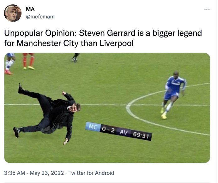 Karena terpeleset, netizen ini menilai Gerrard membantu City juara. Foto: Twitter