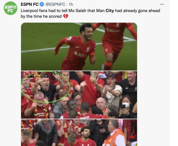 Mo Salah sempat sangat girang setelah memberi Liverpool keunggulan, tapi jadi sedih setelah diberitahu City bisa comeback. Foto: Twitter