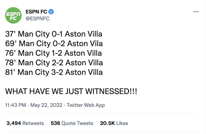 Namun secara dramatis City mampu membalikkan keadaan dan mencetak 3 gol. Foto: Twitter