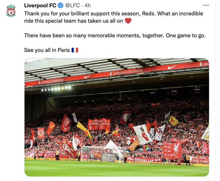 Akun Liverpool mengucapkan terima kasih atas dukungan besar suporter dan bersiap untuk final Liga Champions melawan Real Madrid. Foto: Twitter