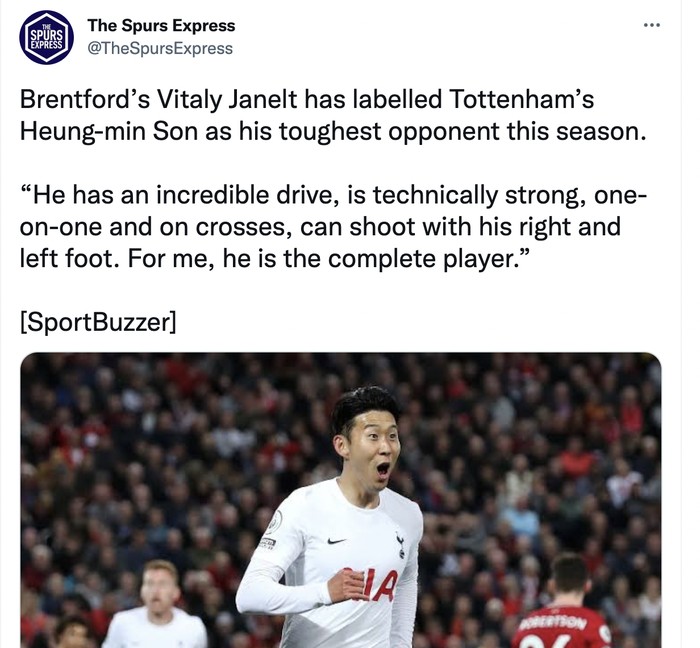 Pemain Brentford mengakui kehebatan Son. "Dia punya semangat luar biasa, kuat secara teknis, one on one dan umpan silang, dengan kaki kanan dan kiri. Bagi saya, dia pemain yang komplet." Foto: Twitter