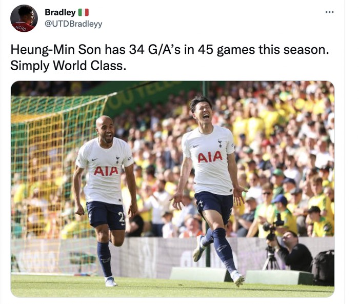 Son total mencetak 34 gol dan assist musim ini dalam 45 laga yang dilakoninya. Sungguh kelas dunia. Foto: Twitter