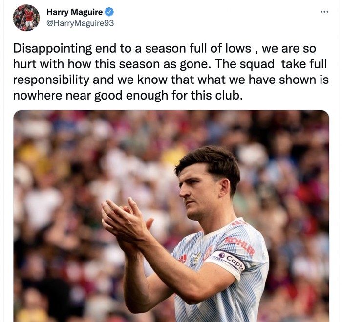 "Akhir musim yang mengecewakan. Skuad ini bertanggungjawab penuh dan kami tahu apa yang kami tunjukkan tidak bagus bagi klub ini," demikian pengakuan Harry Maguire. Foto: Twitter
