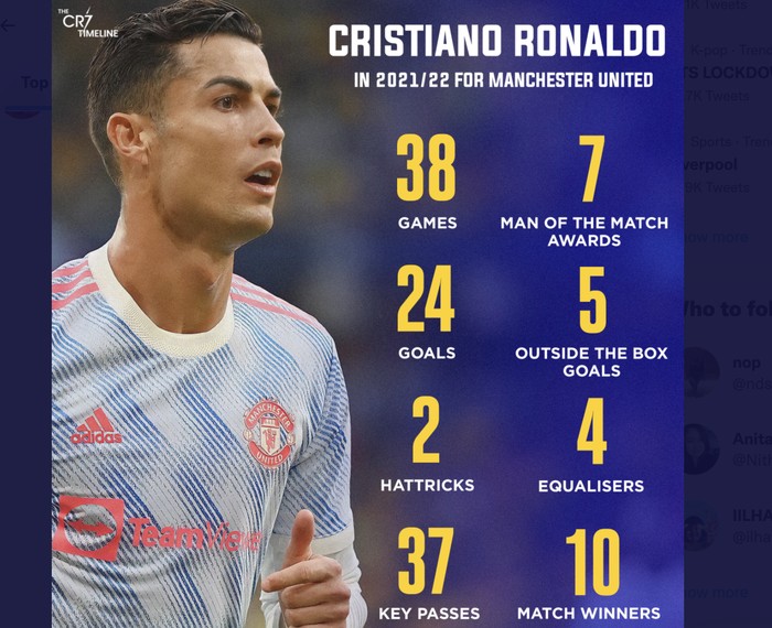 Penampilan Ronaldo musim ini di MU memang mengesankan walau timnya bermain buruk. Foto: Twitter