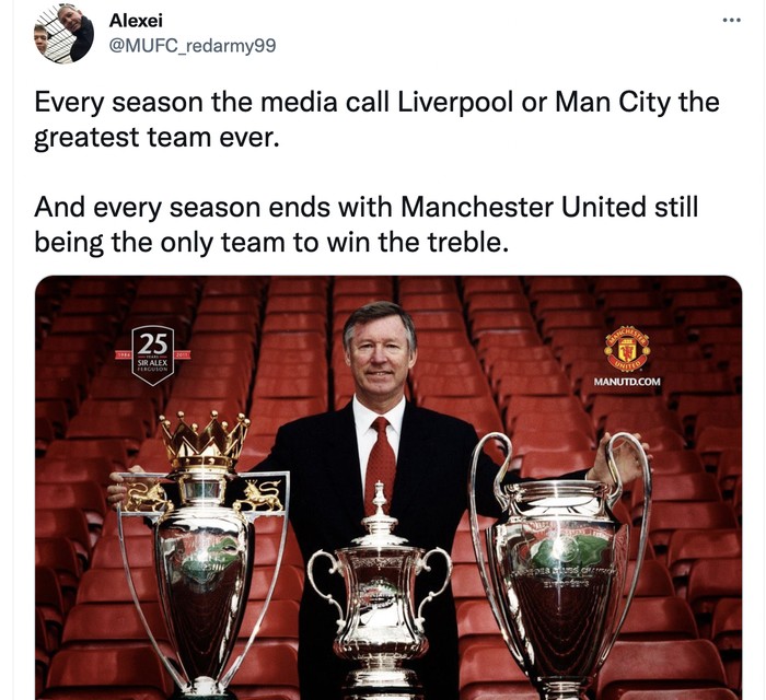 Fans MU ini coba menghibur diri bahwa hanya MU yang pernah meraih treble sejati di bawah asuhan Alex Ferguson. Foto: Twitter