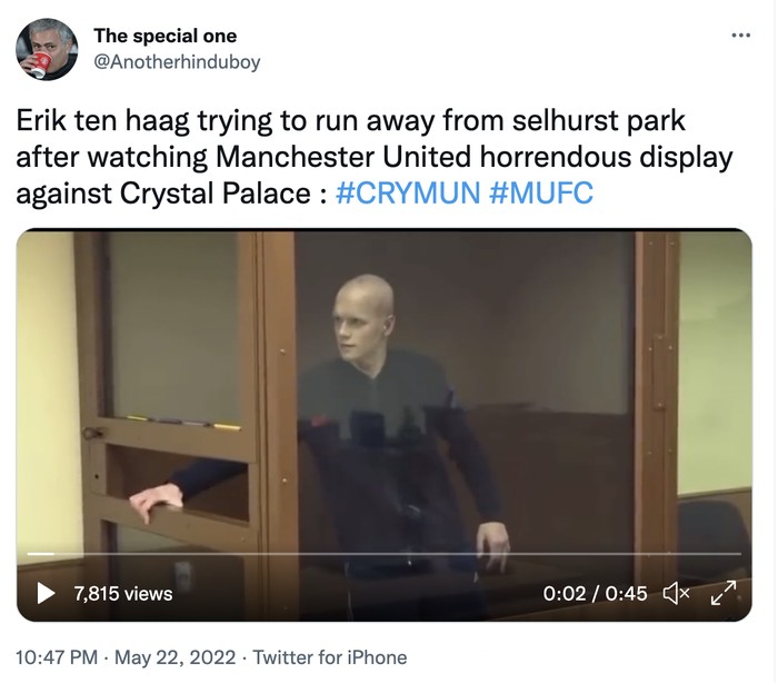 Lelucon bahwa Ten Hag tidak jadi meneruskan kontraknya bersama MU setelah melihat laga terakhir mereka. Foto: Twitter