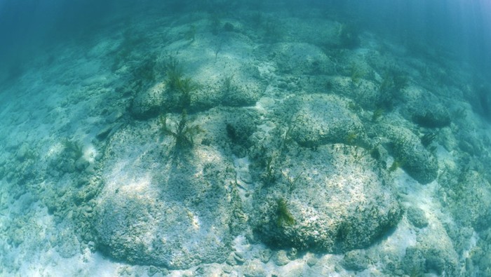 Potret 'Jalan Bimini' di Bahama. Pada tahun 1968,Β ditemukan semacam jalan paving blok batu, 6 meter di bawah laut di North Bimini Island, Bahama. Seempat diduga sisa-sisa Atlantis, tapi ilmuwan bilang iniΒ formasi batuan alami. Foto: The 13th Floor