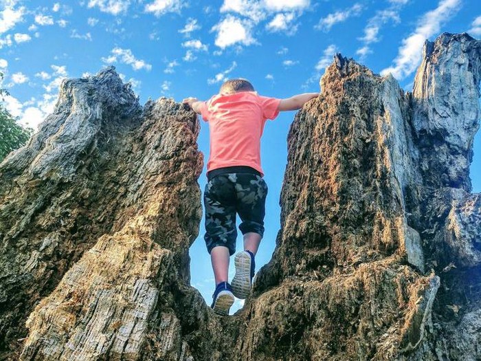 Seorang anak menaiki pohon yang sudah membusuk, tapi terlihat seperti raksasa naik gunung batu.Β Dok. Brightside
