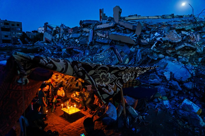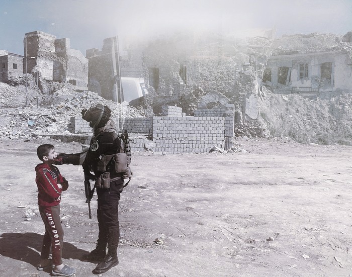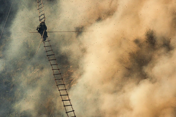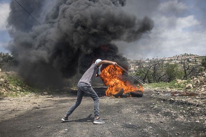 Karya finalisΒ Bruno Thevenin dari Spanyol. Menampilkan warga Palestina terlihat menggunakan ketapel saat berhadapan denga tentara Israel selama bentrokan di desa Kafr Qaddum Foto: All About Photo Awards