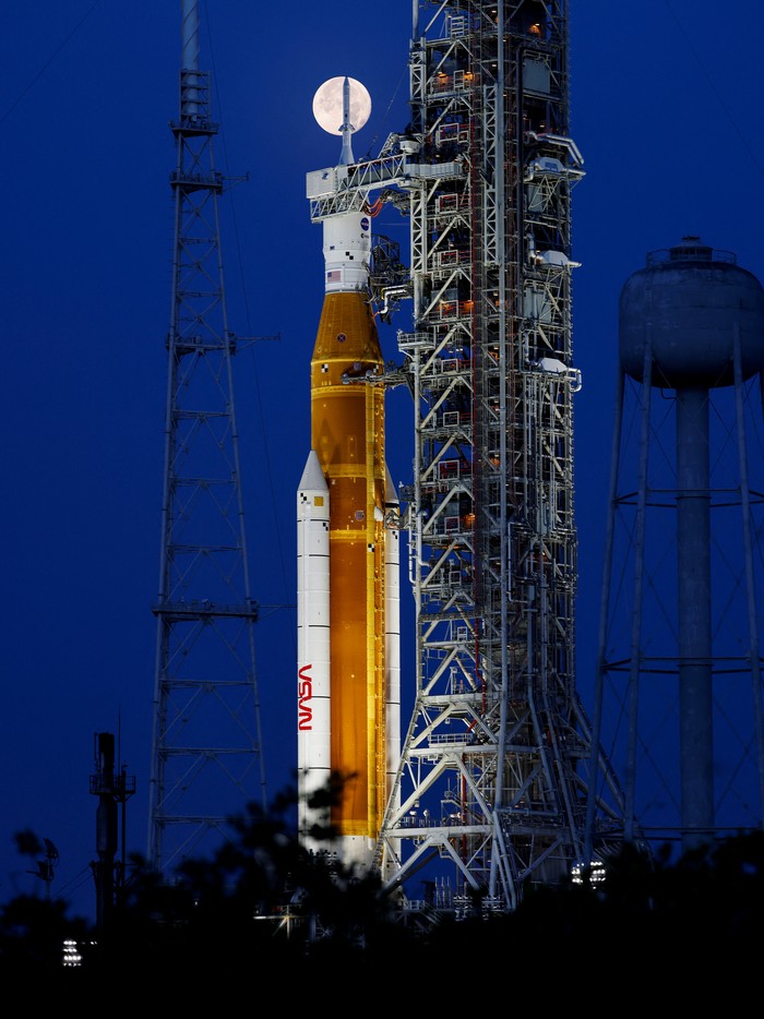 Pemandangan tak biasa namun menawan terlihat saat Bulan Purnama Stroberi seakan bertemu dengan roket Space Launch System (SLS) Artemis 1 yang dibuat NASA untuk misi ke bulan.
