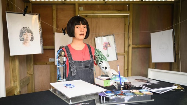 Inggris - Ai-DA, robot seniman pertama di dunia turut hadir dalam Festival Glastonbury, Inggris. Ai-DA melukis potret sejumlah artis yang hadir. Yuk lihat.