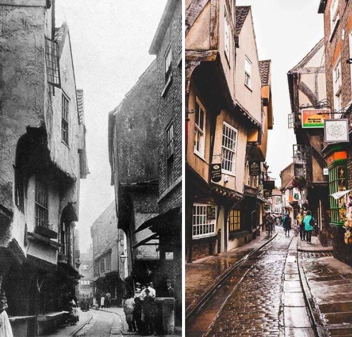 The Shambles In York (Inggris) akhir 1800-an dan sekarang. Foto: Reddit