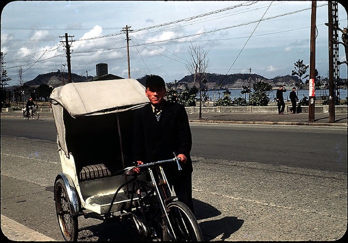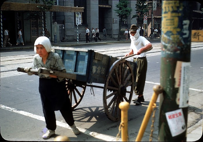 Gerobak masih diandalkan untuk mengangkut barang. Saat itu, Jepang mulai merintis ekonomi sebagai produsen elektronik. Foto: Vintages